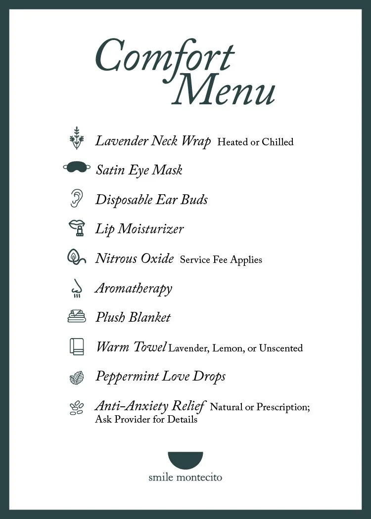 One of Smile Montecito's standout features is its Comfort Menu, which offers a range of amenities designed to enhance the patient experience. This menu goes beyond the standard offerings of most dental offices, providing additional comforts and luxuries to make each visit truly special. Patients can indulge in various services and amenities tailored to their preferences, ensuring that their time at Smile Montecito is as enjoyable and stress-free as possible.